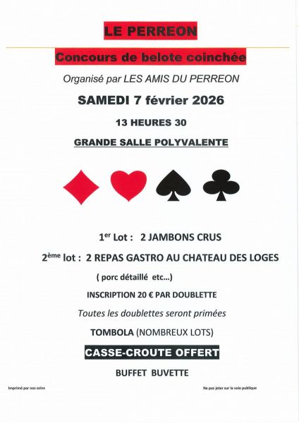 LES AMIS DU PERREON ORGANISE UN CONCOURS DE BELOTE COINCHEE LE SAMEDI 7 FEVRIER